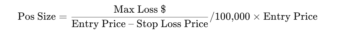 Formula Position  Size = ((Max Loss $) / (Entry Price – Stop Loss Price)) / 100,000 × Entry Price